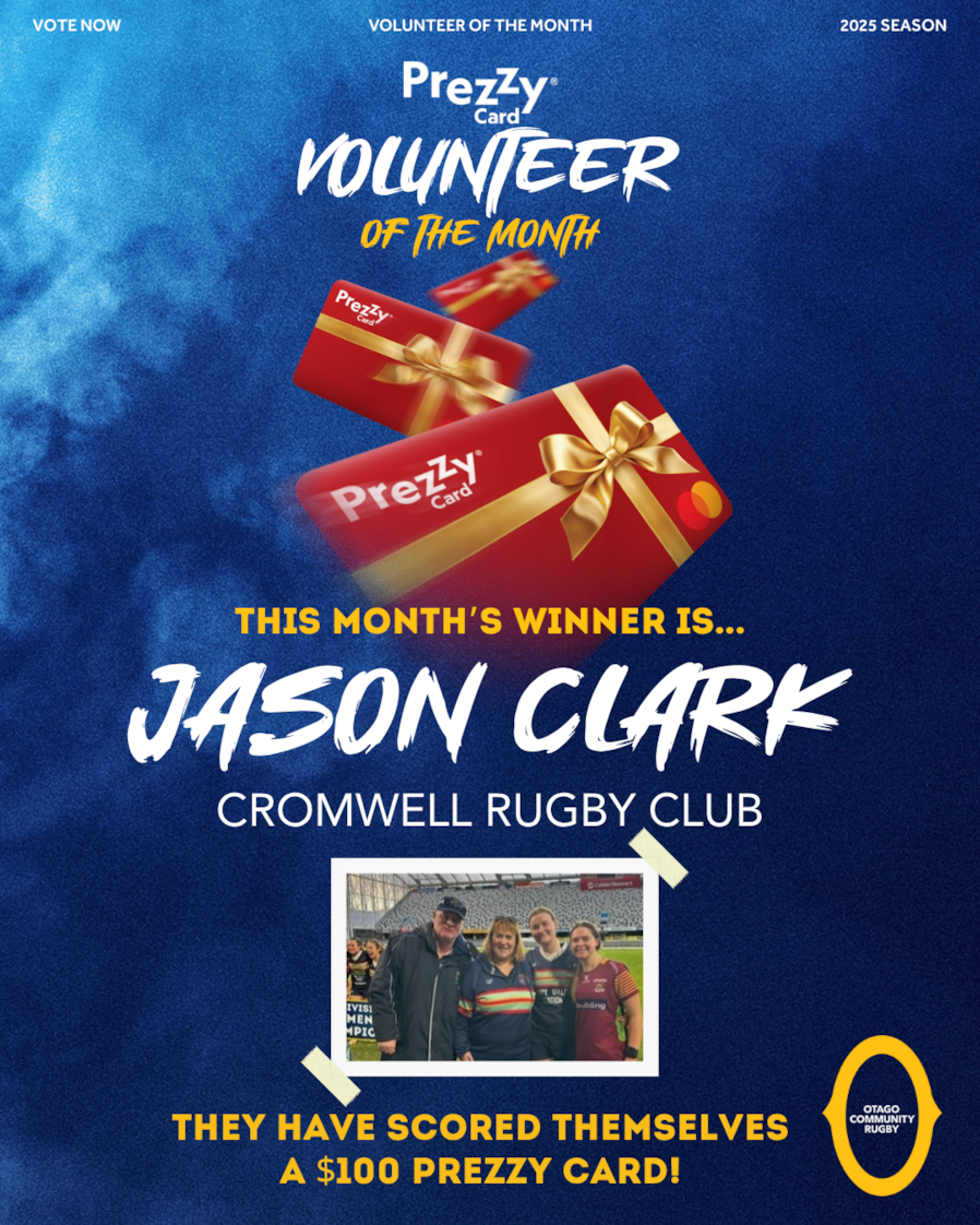 With thanks to supporting partner Prezzy Card - Our Winner for JUNE is Jason Clark- Cromwell Rugby Club "Jason Clark is the definition of grassroots rugby - committed, hands-on and driven to keep the game thriving. This year, on top of his ongoing roles with the Cromwell Rugby Club and as Chair of the Central Council of Clubs, Jason was the driving force behind the launch of the Central Otago Spikers, a team created to keep Colts age players connected to rugby beyond school and bridging the gap between school and senior club rugby. He also co coached the Central Otago Women's team who went on to win the Division 2 banner this season! Jason’s leadership, dedication and love for the game continues to make a lasting impact across the Central Otago region." Congratulations Jason you have scored yourself a $100 Prezzy Card! All other nominees, Caleb Neilson, Marty McArthur and Jamie Mowatt have scored themselves a $50 Prezzy Card Thank you to all our volunteers for the work that you do for our rugby community week-in, week out. We couldn't do it without you all!  |