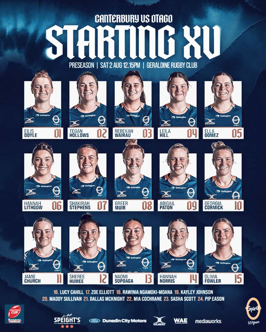 Otago Spirit Coach, Matt Direen, has named his starting XV for the preseason game against Canterbury in Geraldine, at the Geraldine Rugby Club, on Saturday 2 August 2025, Kick off 12.15pm. Direen is “looking to continue to build towards our first FPC game and will be trialling a couple of players in unfamiliar positions”. The team is looking forward to a good hit out vs a quality opposition. If you are in the Geraldine area head on down to support the team!