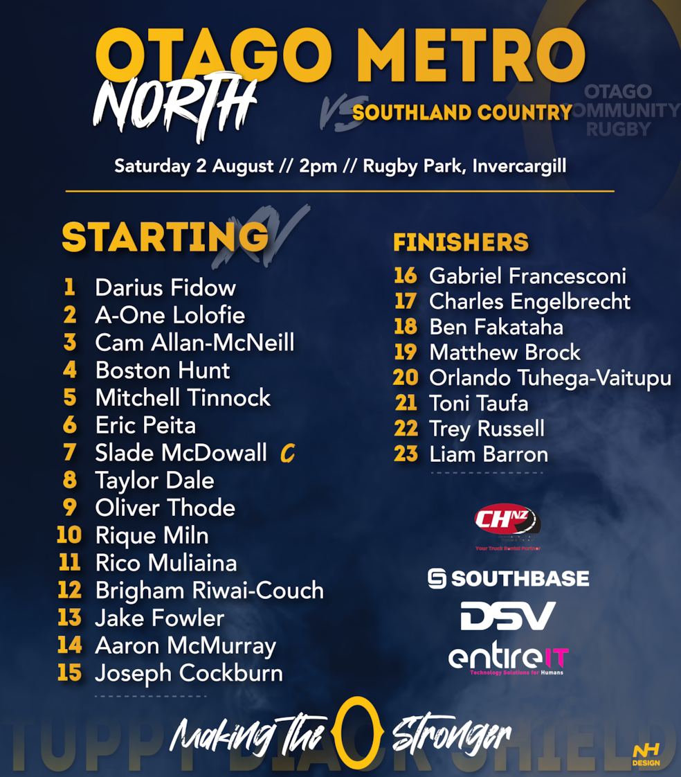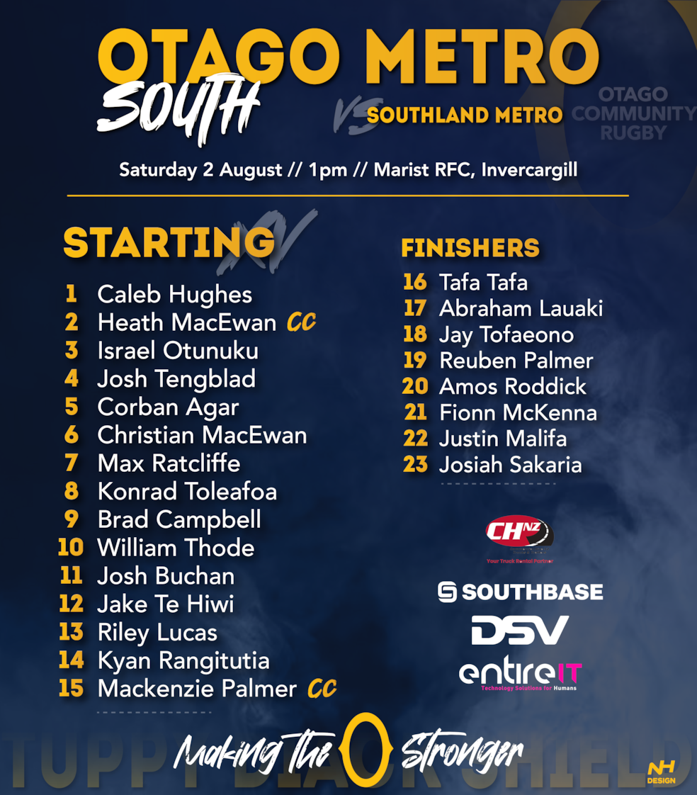 Several Otago NPC squad members have been selected to represent their Metro regions in this fixture: Josh Tengblad, Max Ratcliffe, Konrad Toleafoa, and Jake Te Hiwi (Metro South) and A-one Lolofie (Metro North).  |