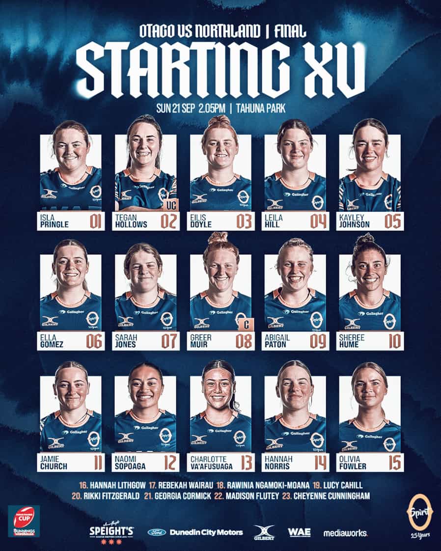 Otago Spirit Head Coach Matt Direen has named his side to play against the Northland Kauri in the Championship Final of the Farah Palmer Cup presented by Bunnings Warehouse this Sunday 21 September 2.05pm at Tahuna Park, Dunedin. The Otago Spirit go into the Final unbeaten for the season. Greer Muir will captain the Spirit, with Tegan Hollows as vice-captain. Gates open at Tahuna Park at 1.15pm - Gold Coin Donation 2025 MANAGEMENT STAFF:Head Coach: Matt Direen Assistant Coaches: Ryan Griffith, Marty Hurring, Hayden Finch S & C Coach: Pete Fleming Physio: Mikayla Rosieur Manager: Cathy Charles Assistant Manager Aria Monaghan Analyst: Bella Rewiri-Wharerau  |