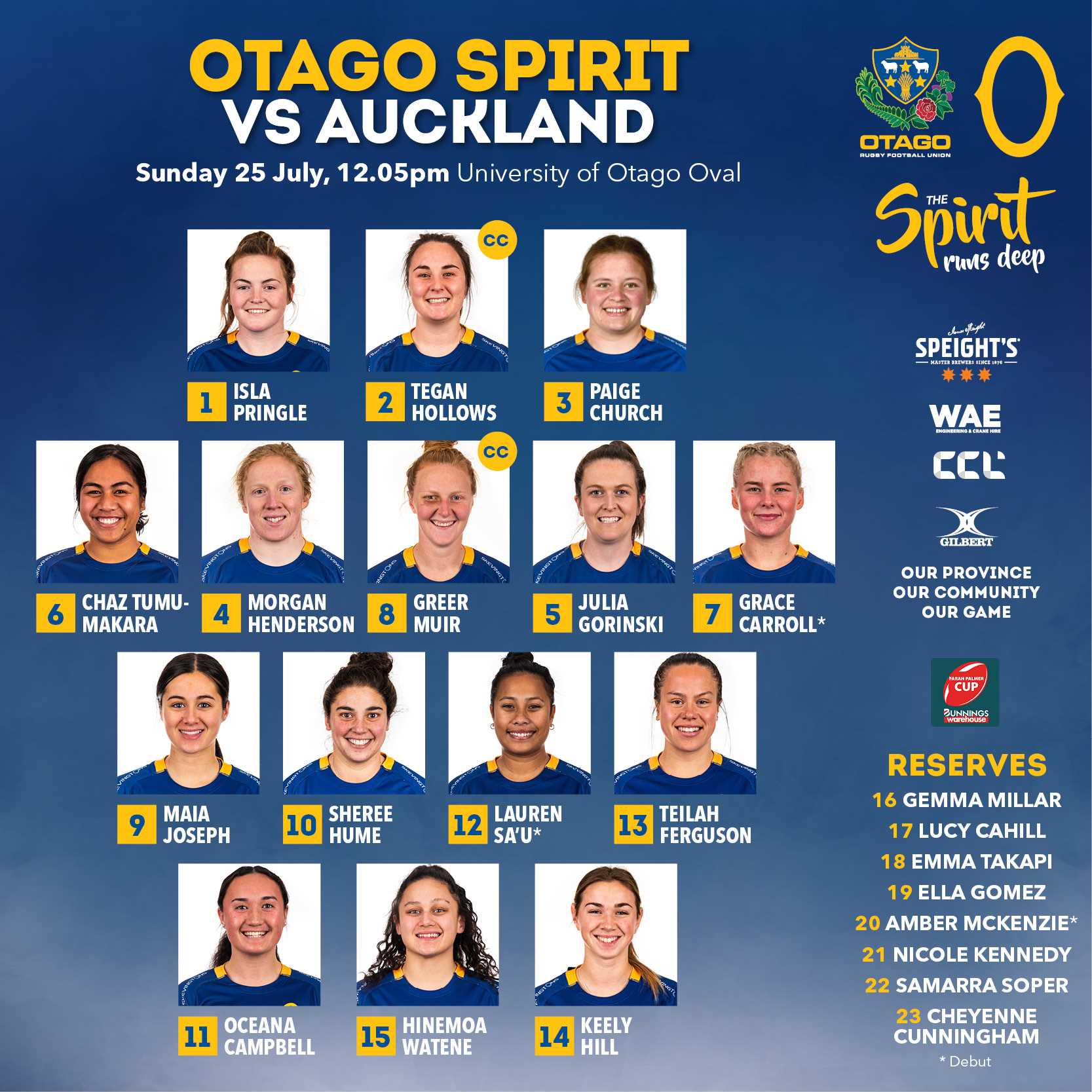 Here is your Otago Spirit team line up ready to take on Auckland Storm in the second round of the Farah Palmer Cup this weekend. Kick off is this Sunday 12:05pm, Uni Oval 💙💛