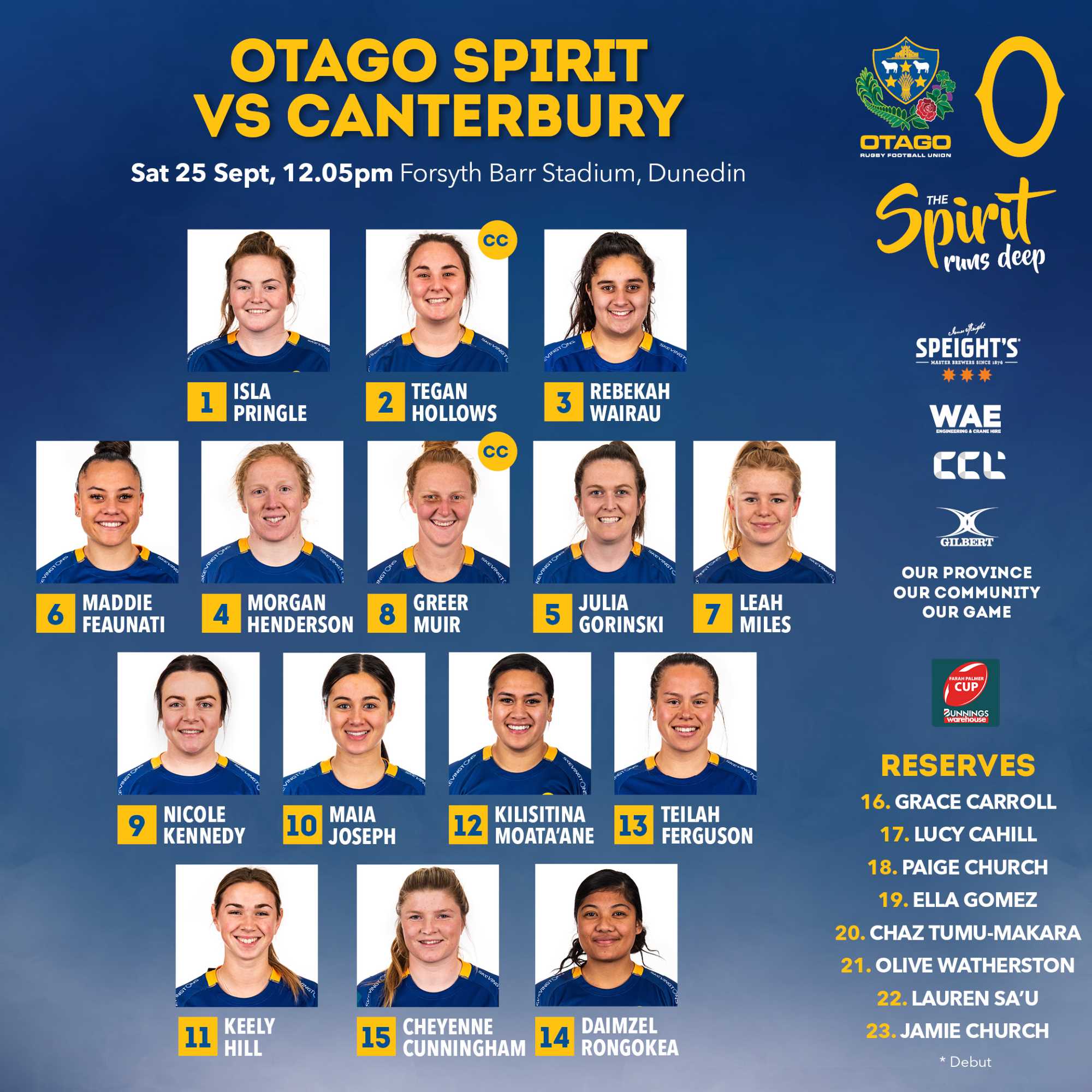 Our Otago Spirit team line up set to take on Canterbury this Saturday.